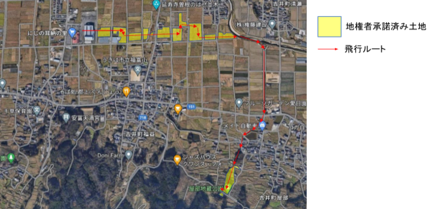 飛行ルートは、地権者の承諾を得たルートで計画し、ドローンの飛行下に第三者が侵入しないよう目視人を配置したレベル2飛行にてドローンの飛行を実施します。