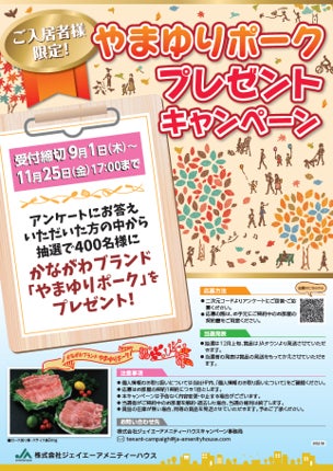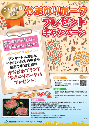 当社管理物件のご入居者様で、2022年9月1日から2022年11月25日までの間にアンケートにお答えいただいた方の中から抽選で400名様にかながわブランド「やまゆりポーク1kg」をプレゼントいたします。