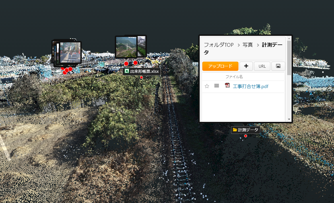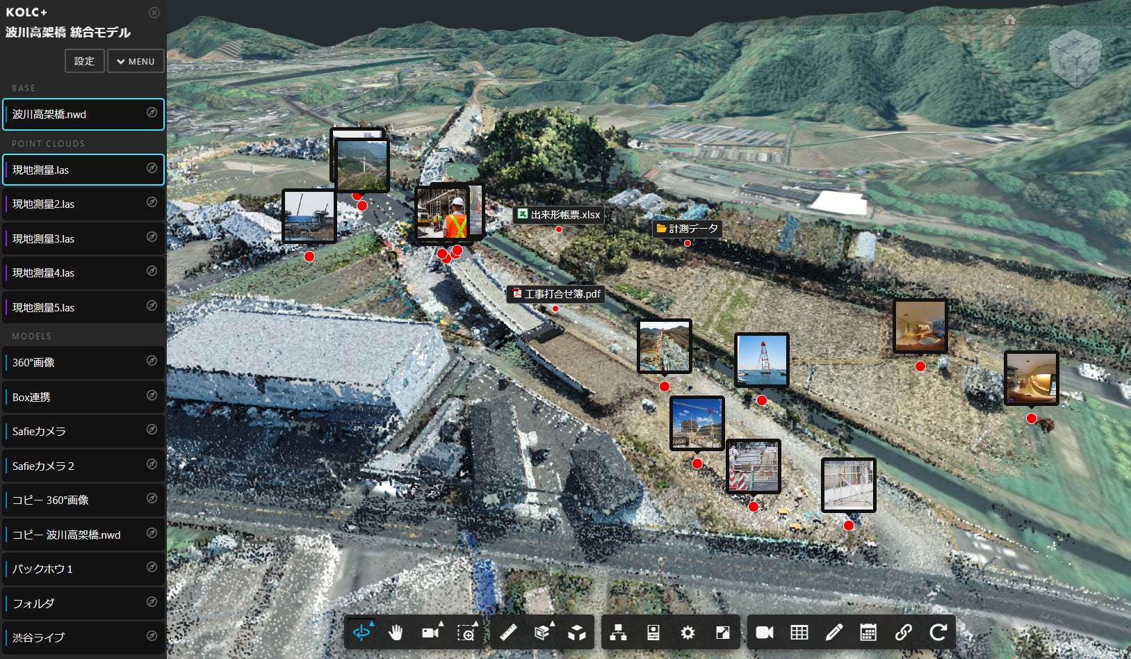 KOLC+の「統合アプリ」を使って構築したデジタルツイン(BIM/CIMモデル、点群、3D地図を統合)に、写真や動画が入ったフォルダを連携するだけで、そのフォルダ内からファイル情報を取得して自動的に3D空間にプロットします。例えば、現場にて iPhone や iPad でGPSを有効にした状態で写真を撮影して、KOLC+のフォルダにアップロードした場合は、即座にデジタルツイン上にサムネイル画像と位置を反映できます。もし標高が付与されていない場合は、自動的にモデル上面にプロットされます。もし、RICOH THETA で撮影した360°写真や動画であれば、360°ビューアでプレビュー可能です。