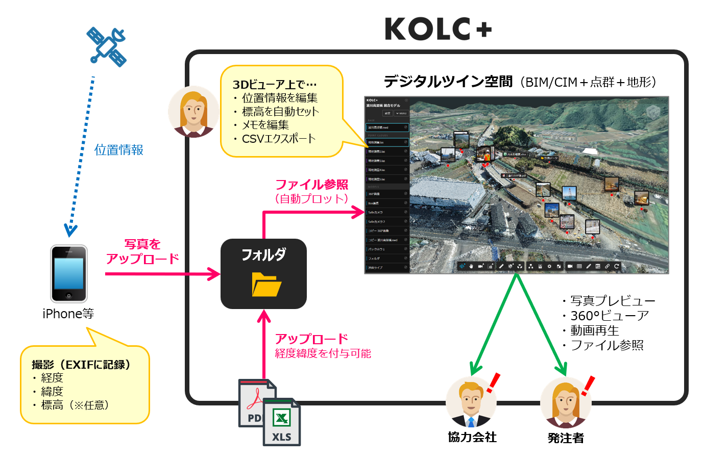 通常、BIM/CIMモデルや点群データに使われる座標系と、写真のExif情報に付与される座標系は異なり、それぞれを統合して同じ空間にマッピングするには、座標変換などの手間がかかっていました。さらに、カメラによってはGPSの緯度経度のみをExifに付与し、標高は付与しない端末もあるため、3次元での写真管理は非常に手間のかかる状況でした。そこで、KOLC+では、以下の3つの機能を実装することで、デジタルツイン上での写真管理を圧倒的に簡単に実施できる仕組みを実現しました。