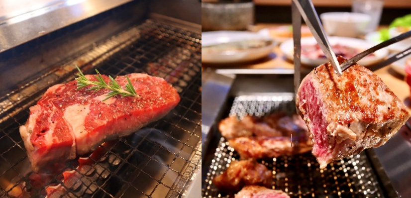 大きな塊肉のまま提供されるので、お好みの焼き加減で両面を焼いていただき、はさみで食べやすい大きさにカット。