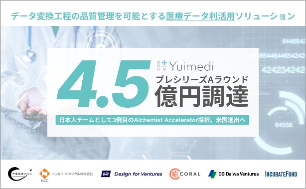 医療データ利活用プラットフォームを開発する株式会社Yuimedi(本社:東京都港区、代表取締役:グライムス英美里、以下「Yuimedi」)は、プレシリーズAの第三者割当増資を実施し、総額4.5億円を資金調達したことをお知らせします。本ラウンドでは千葉道場ファンド、Nissay Capital、D4V、Coral Capital、DG Daiwa Venturesに加え、既存株主であるIncubate Fundを引受先としております。