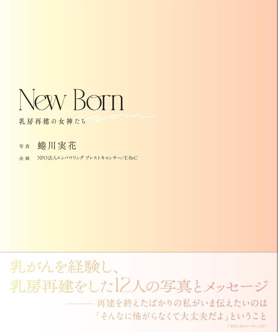 写真集のタイトル『New Born—乳房再建の女神たち—』の「New Born」には、「生まれたての」「新生の」という意味があります。「乳房再建を経て、新生した女性たちの写真集である」ことを表現いたしました。