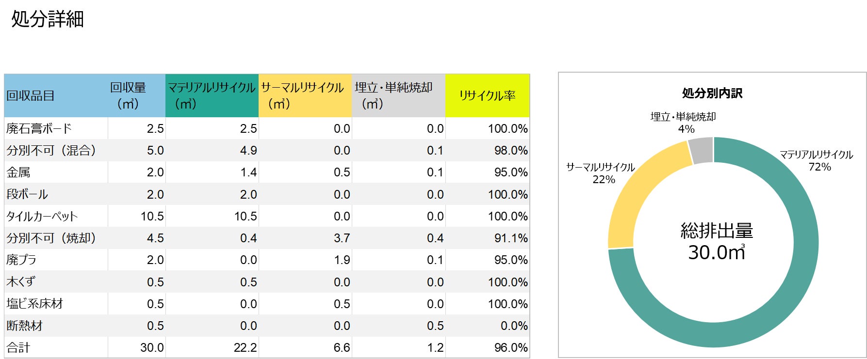 これまでのスペースソリューション事業部のオフィス構築では、発生する廃棄物の約20%がリサイクルされずに廃棄されていました。2023年の新オフィスの入居工事においては、オフィス構築において発生する廃棄物を限りなくゼロにすることを追求する「廃棄ゼロ」にチャレンジいたしました。設計・工事計画・現場それぞれの段階で廃棄物の削減に取り組み、その結果、全産業の産業廃棄物の平均リサイクル率を大幅に上まわるリサイクル率96%を達成しましたのでご報告いたします。
