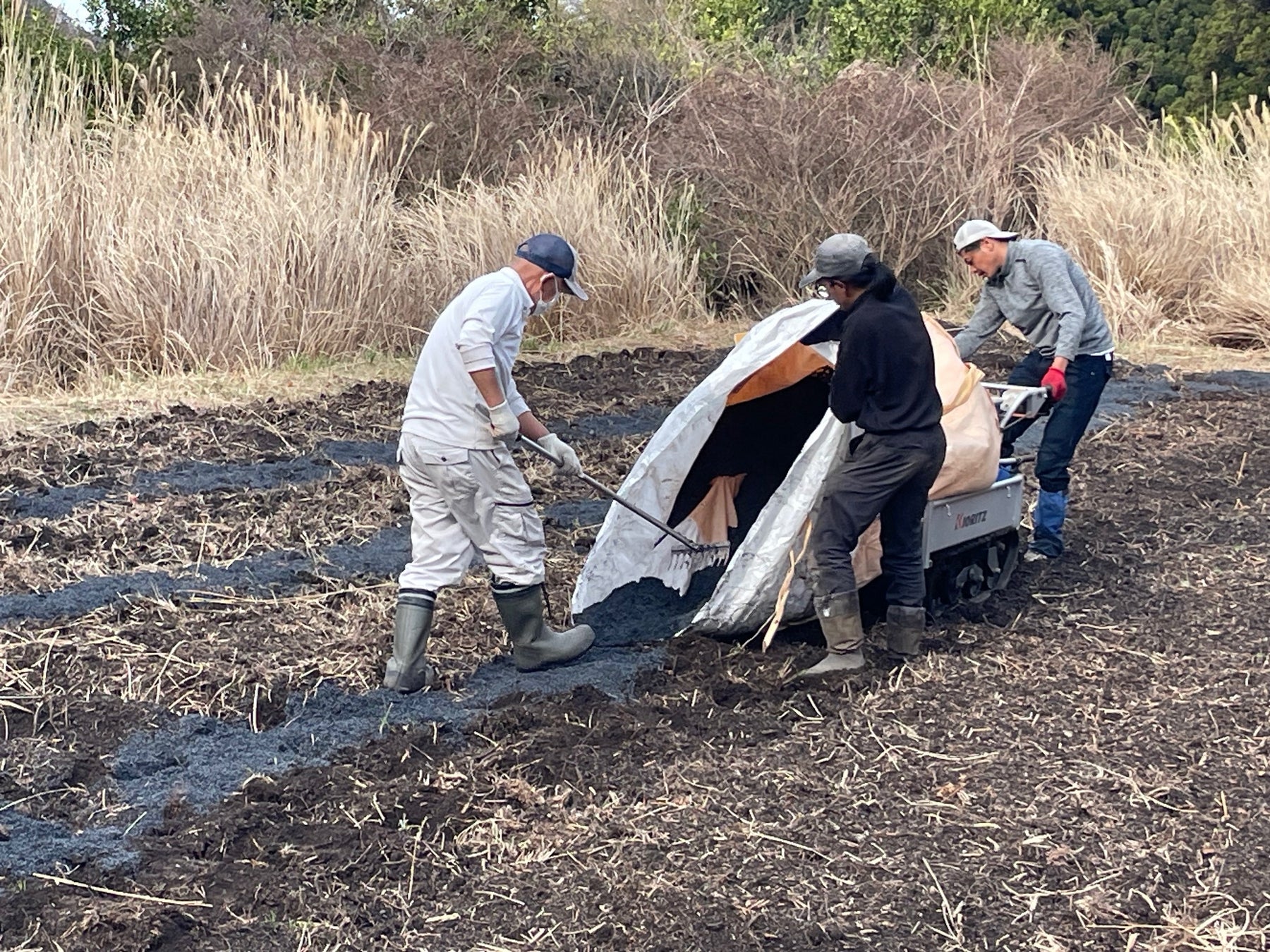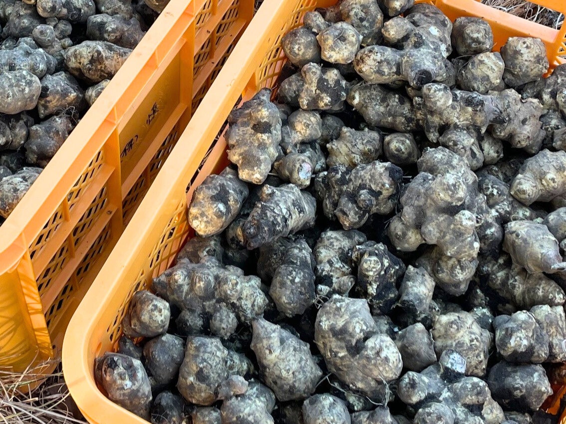 環境再生型GX農業は、林地に放置された剪定枝や支障木などの廃棄バイオマスを炭化し、耕作放棄地に施用することで土壌を再生する取り組みです。炭素を土壌に固定することでCO₂の排出を抑え、気候変動対策にも貢献。こうした農地では、農薬や化学肥料を一切使わず、微生物が豊かに息づく“生きた土壌”の中で、菊芋が本来の生命力を発揮します。