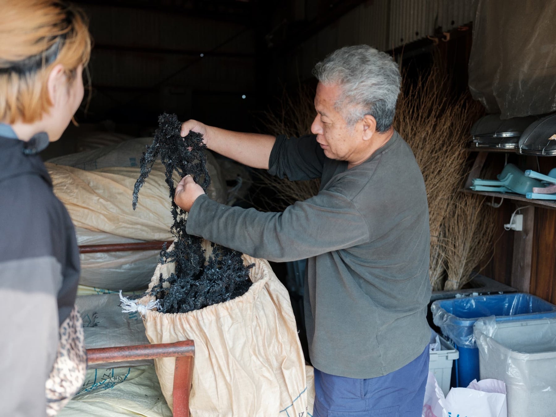 富江町で乾燥ひじきを製造しているマルキン水産食品。ひじきの茎の部分を指す「長ひじき」は、五島では昔から冠婚葬祭など大事な時に食べられています。年に1度、GW前後の3週間の間に全て水揚げされるひじきを、天日干しと蒸す工程を繰り返し、手間をかけてつくられた今では貴重な国産ひじきです。