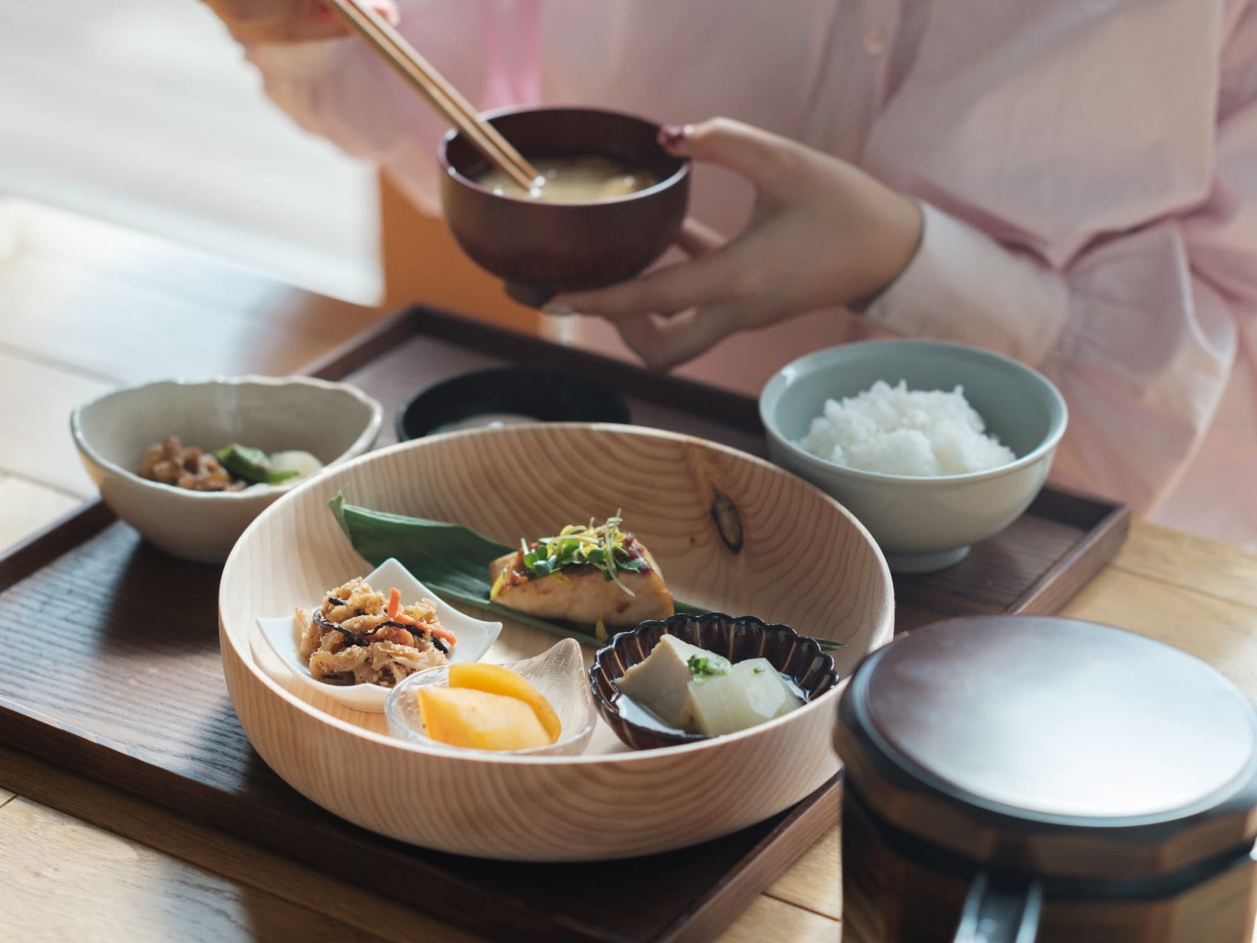 シェフ自ら生産者のもとへ足を運びひとつひとつ選んだ、五島の新鮮な魚介や卵、古くから島内で使われている長ひじきや麦みそなどを使用し、それぞれの食材が主役になるようあえてメインを作らず小鉢四種からなるメニュー構成に仕上げました。既製品は使わず、すべて手作りで食材の味わいが楽しめる、からだとこころに優しく染み渡る、ヘルシーな朝ごはんです。