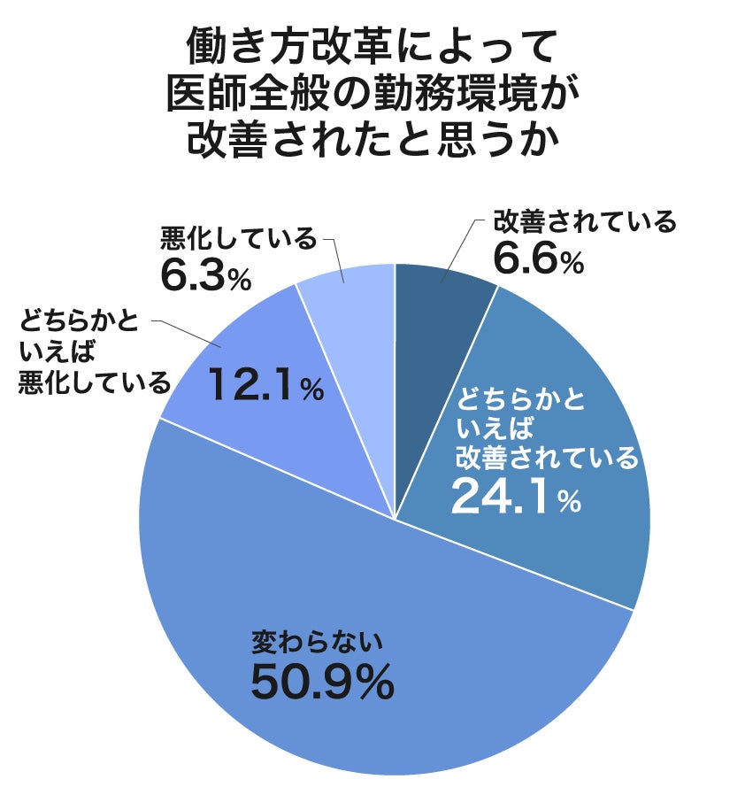 その結果、残業時間など多くの調査項目において大きな変化は見られず、医師の半数以上が「制度の施行前後で勤務環境は変わっていない」と感じていることが明らかになりました。
