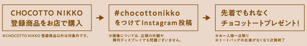 CHOCOTTO NIKKOプレイヤー参加店舗のお店で購入・飲食した登録商品を、指定ハッシュタグ【 #chocottonikko 】をつけてInstagramに投稿 → 投稿画面をお店で見せた人に、先着で「チョコットート」をプレゼント。