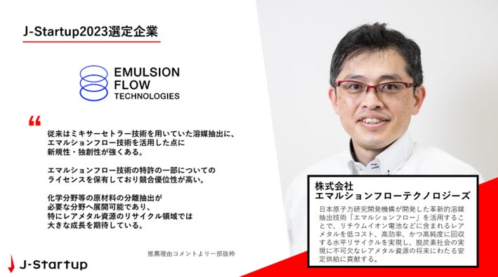 株式会社エマルションフローテクノロジーズ(本社所在地:茨城県那珂郡東海村、代表取締役:鈴木裕士、以下当社)は、経済産業省が推進するスタートアップ支援プログラム「J-Startup」の2023年選定企業に選ばれたことをお知らせいたします。