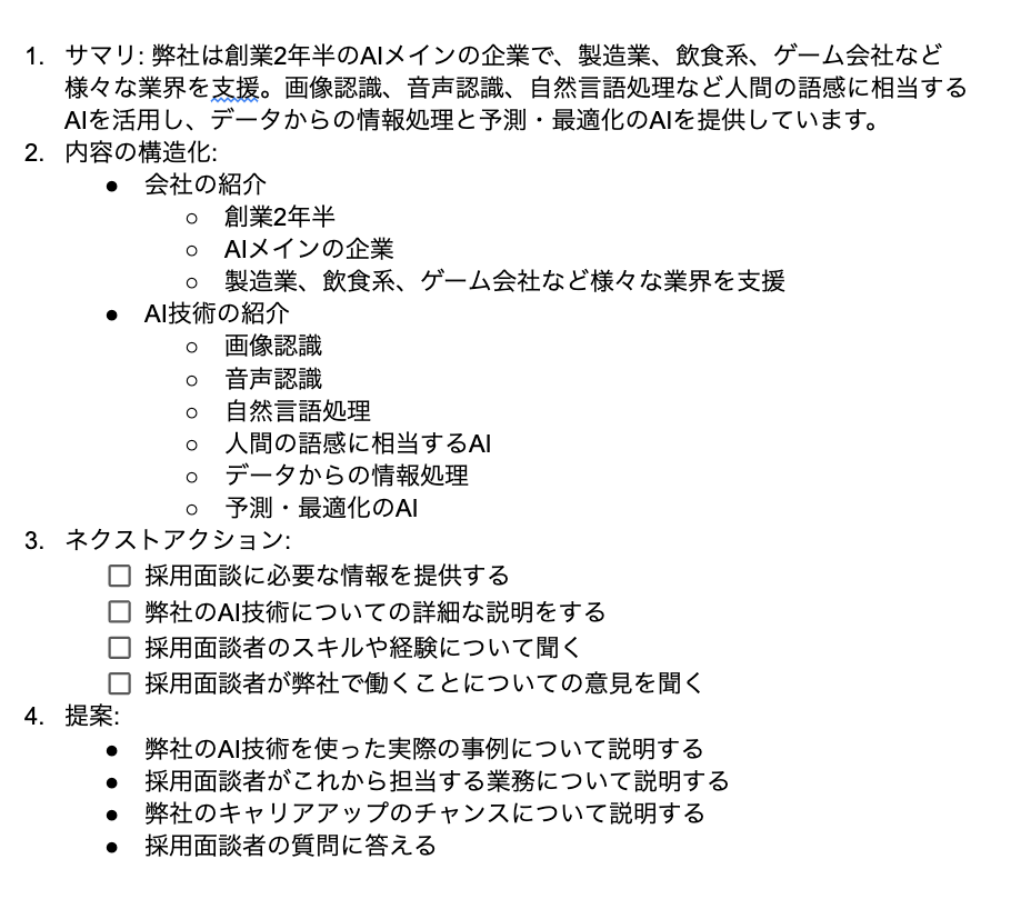 *以下 CalqTalkによる音声データの「サマリ」、「構造化」、「ネクストアクション」「提案事項」の4点を提案。