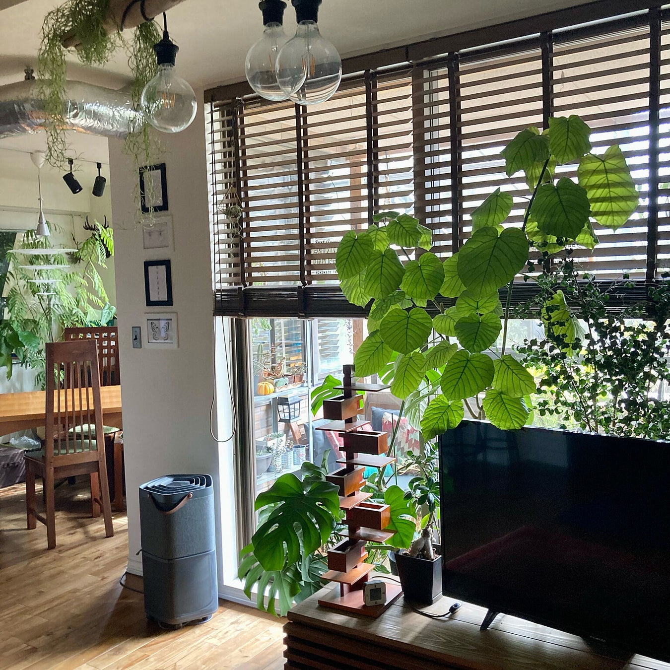 グリーンが印象的な空間と、相性バツグンの木製ブラインド「フォレティア」をコーディネートしたお部屋。「視線は隠して光を通す」といういちおしポイントはブラインドだからこそ!たくさんのグリーンと光あふれるお部屋が素敵です。