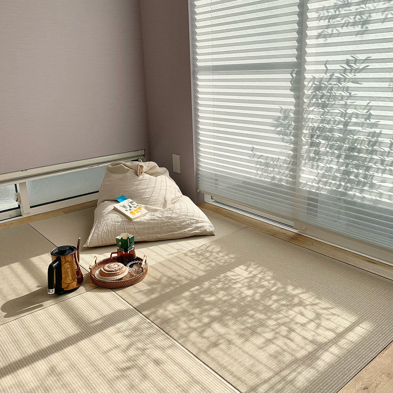 プリーツスクリーン「ペルレ」の落ち着いた雰囲気とぴったり合った和の空間。生地を通して入り込む木漏れ日が、見ているだけでほのぼのする素敵なお写真でした。これからもコーヒータイムのお供にしていただけたら嬉しいです♪