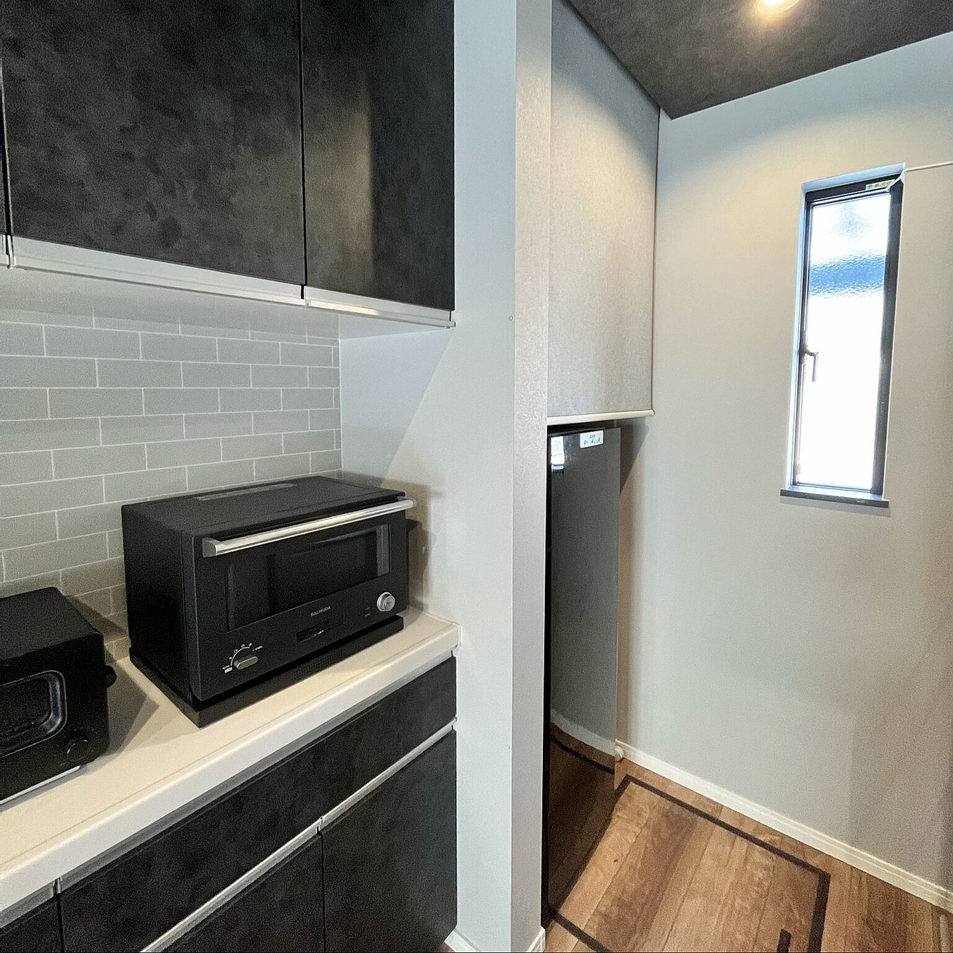 ロールスクリーン「ラルクシールド」を冷蔵庫スペースの目隠しに使用いただいているキッチン。フラットなグレーのロールスクリーンが、キッチン全体のインテリアに調和していて、探さないと気が付かないほどの考えられた使い方に驚きました!