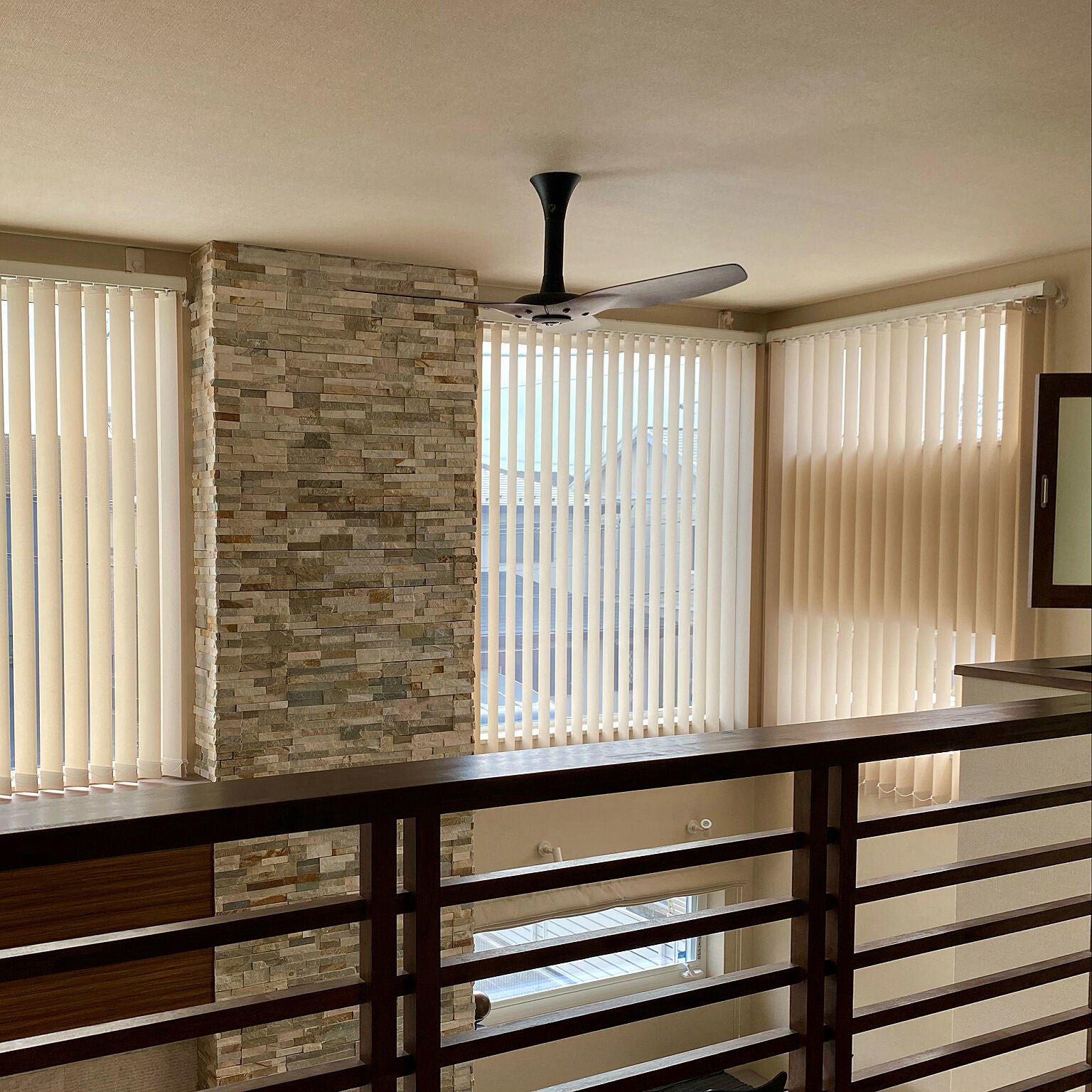 電動のタテ型ブラインド「ホームタコス ラインドレープ」を吹き抜けに使用されています。「朝、一斉に開けられる」という電動ならではのコメントも一緒に投稿いただきました!タテのラインによって高い天井がより際立っていて、すっきりとした空間に目を惹かれました。