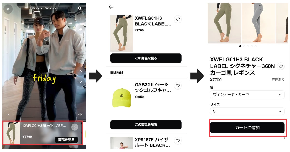ショッパブルビデオの最大な特徴は、動画の視聴からシームレスに購入ができる点です。動画視聴時に紐づいた商品が表示され、他ページへ遷移することなく商品情報を閲覧し、カートに追加することができます。動画から購入までの導線がスムーズなため、コンバージョン率の向上につながります。