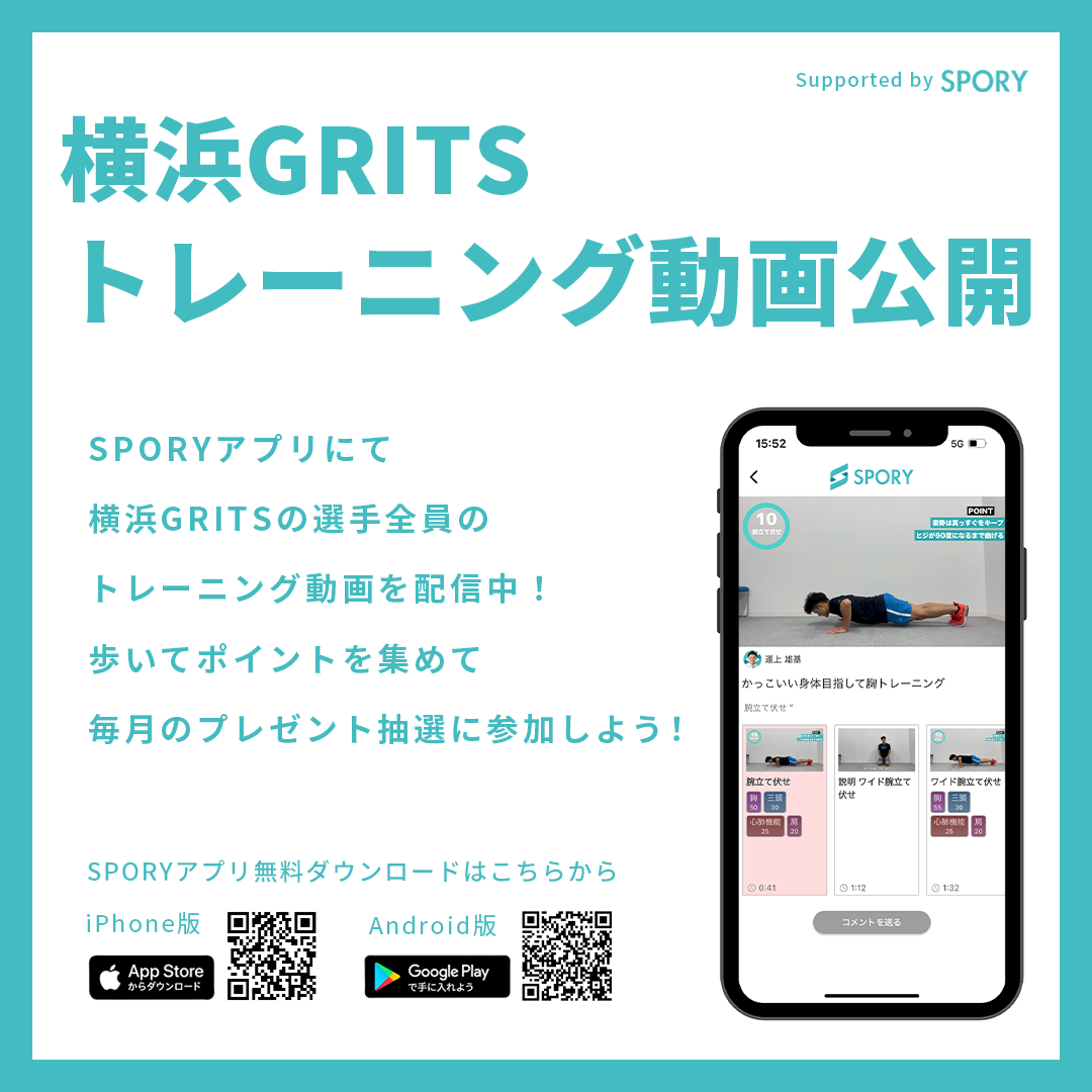 横浜GRITS全選手のトレーニング動画をSPORYアプリにて公開、横浜GRITSプレミアムマーケットの開設、アプリ内でのトレーニング成績を元にファンと選手がリアルイベントで競い合う横浜GRITSヘルスケアデイの開催等を予定しており、ファンは元よりスポンサー企業や地域に対しての貢献機会の拡張も行います。