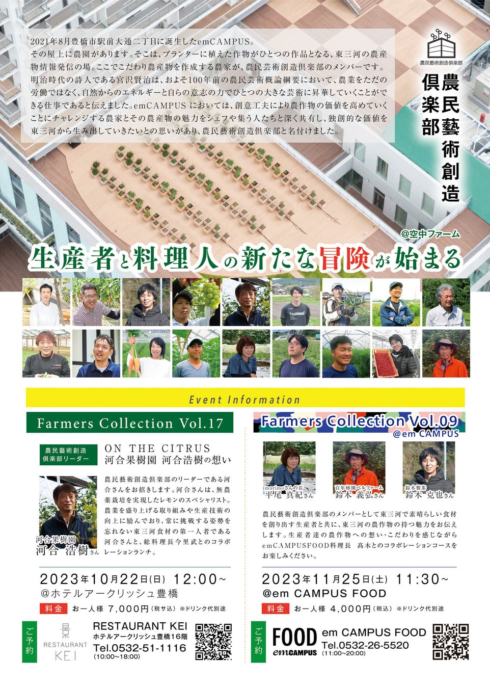 明治時代の詩人である宮沢賢治は、およそ100年前の農民芸術概論綱要において、農業をただの労働ではなく、自然からのエネルギーと自らの意志の力でひとつの大きな芸術に昇華していくことができる仕事であると伝えました。emCAMPUSにおいては、創意工夫により農作物の価値を高めていくことにチャレンジする農家と、その農産物の魅力をシェフや集う人たちと深く共有し、独創的な価値を東三河から生み出していきたいとの思いがあり、農民藝術創造倶楽部と名付けました。