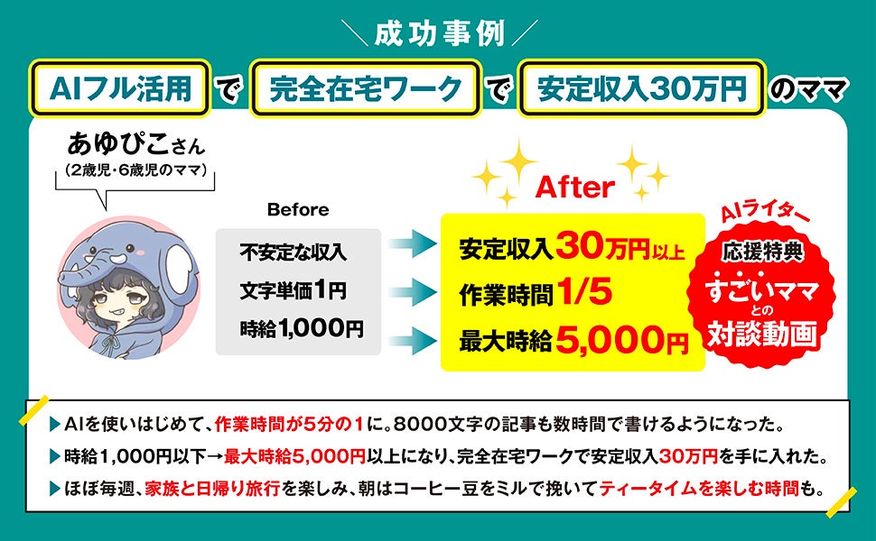 他にも、AIと英語の力で海外案件を獲得し、3か月で150万円を達成した事例やYouTubeシナリオ台本の全工程をAI活用することで、作業効率を3分の1にした事例も掲載。またAIで時給を1,000円から5,000円以上に引き上げ、完全在宅ワークで安定収入月30万円を作り出した2児のママの事例も。家族との日帰り旅行や朝のティータイムなど、働くママの悩みである「家族との時間」の確保に成功しています。