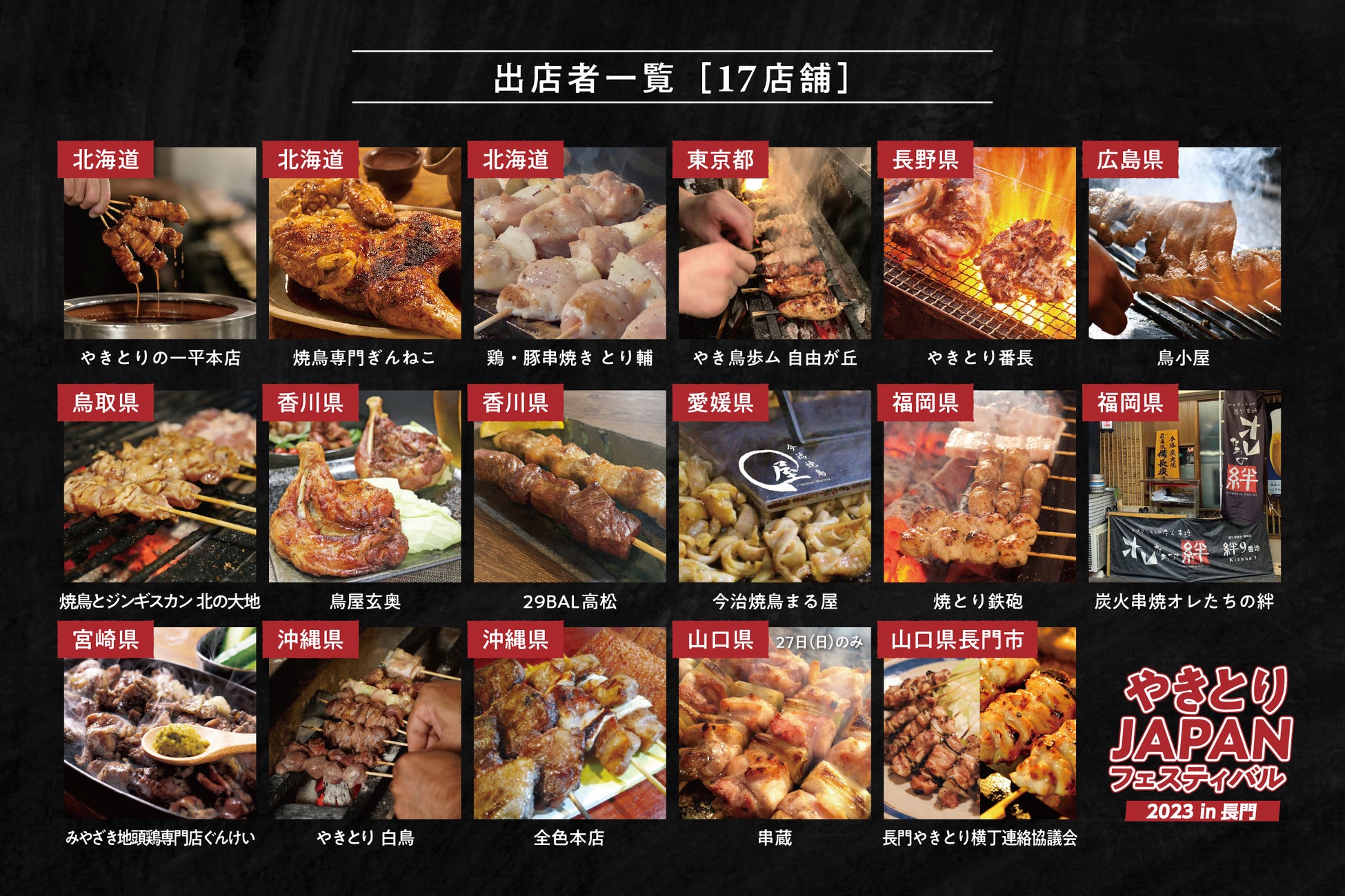 北は北海道から南は沖縄まで、全国のご当地焼きとり店16店舗に、地元長門やきとり横丁連絡協議会を加えた合計17店舗、また会場内では地元特産品販売コーナーも出店します。ステージでは特別協賛のキリンビール株式会社によるじゃんけん大会や、ご当地やきとり店主&テレビコメンテーターとしても活躍中のフードライターはんつ遠藤氏によるトークショーなど、各種ステージイベントの開催も予定されています。