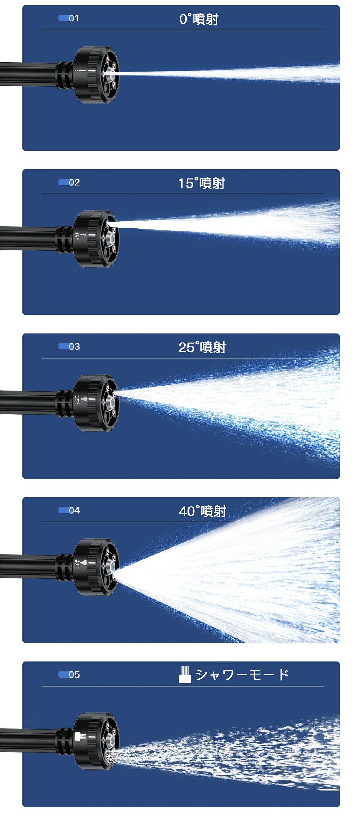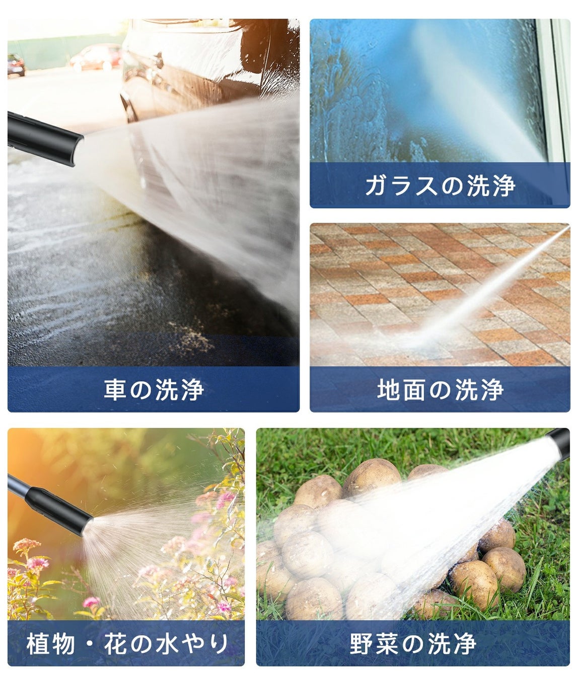 ●5in1可変ノズル付き、洗車、床掃除、水やり、一気に終わらせる。ノズルを回すだけで、適切な角度と水圧に調整できます。