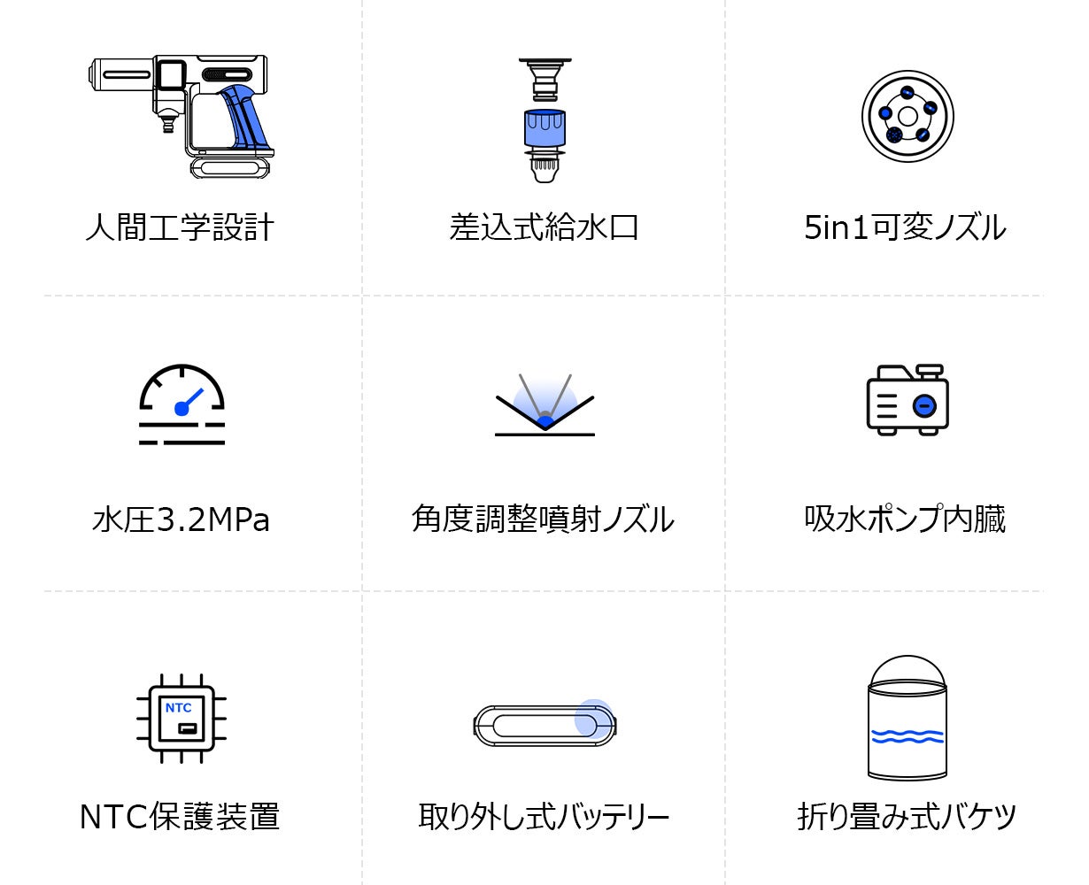 五つの噴射モード搭載で洗車、窓の洗浄、植物の水やりまで!わずか1.59kg、持ち運び簡単で女性でも片手で楽々操作。コードレス・二段階水圧調節可能で自由自在に掃除できます。