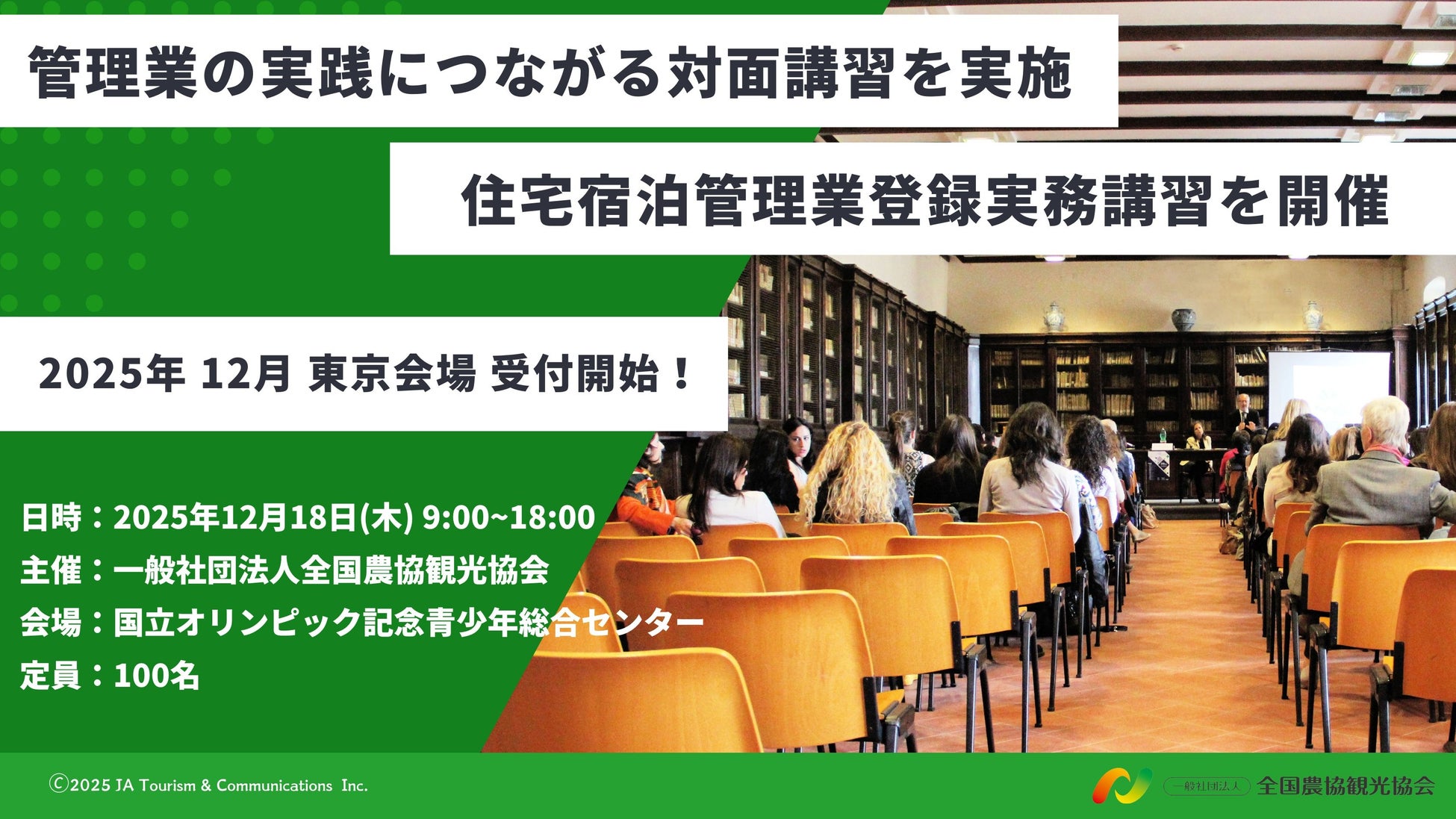 一般社団法人全国農協観光協会【登録番号(1)第01号 】(本所:東京都千代田区、代表理事会長:篠原末治)は、2025年12月18日(木)に国立オリンピック記念青少年総合センター(東京都渋谷区)にて「住宅宿泊管理業登録実務講習」を開催いたします。