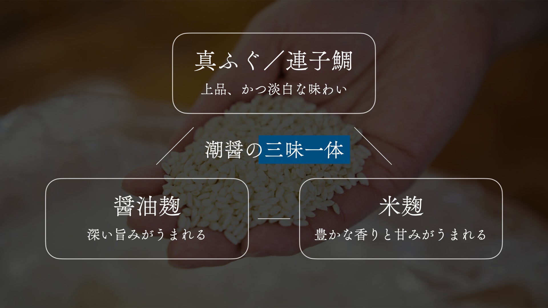 上品で淡白な魚介をベースに、醤油麹と米麹を組み合わせることで『三味一体』の深い味わいを実現