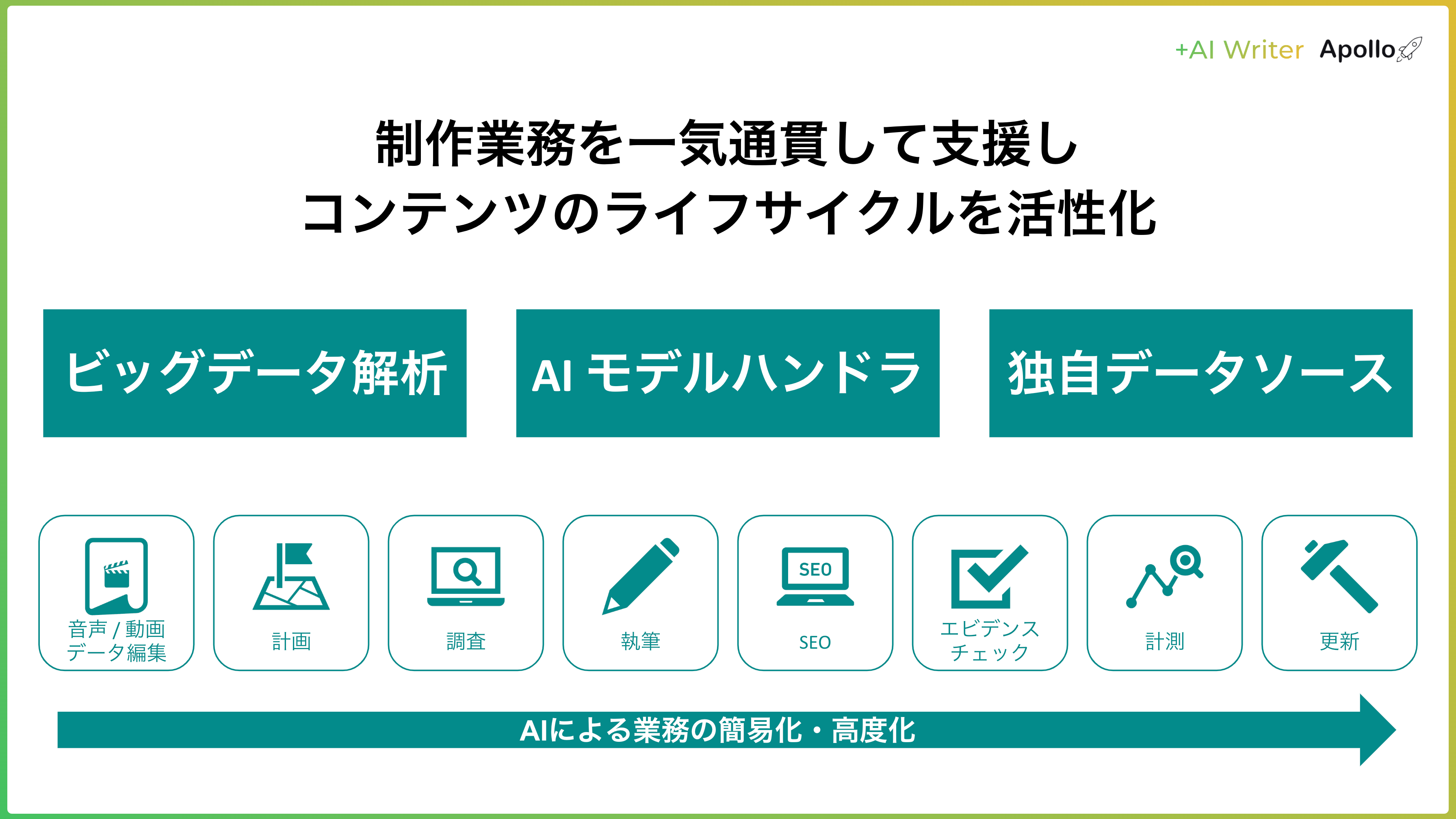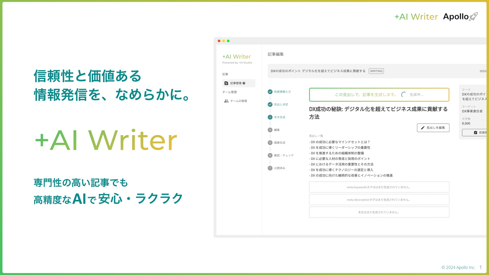 Apolloでは、昨今の生成AIを中心とする急速なAI技術の進化を受け、マイクロソフト社の「Azure OpenAI Service」などの生成AIサービスを駆使してSEO効果を最大化するコンテンツ制作支援SaaS「+AI Writer」を開発しています。加えてApolloは生成AIを用いた業務改善や付加価値の創出に多くの投資をしています。