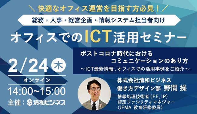 株式会社清和ビジネス(本社:東京都中央区 代表取締役:勝本 浩史)は、2月24日(木)にオフィス運営を担当する、総務・人事・経営企画・情報システム担当者向けに「オフィスでのICT活用セミナー」をオンライン開催いたします。