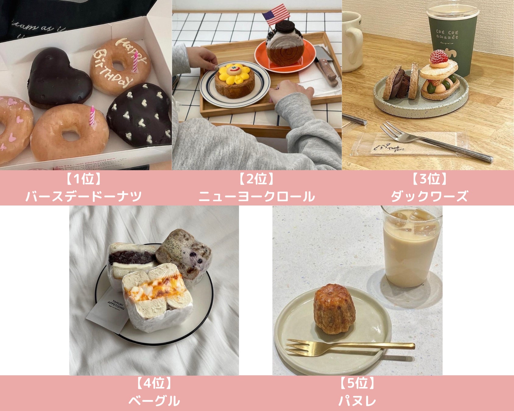 2位はニューヨーク発祥のパイである「ニューヨークロール」がランクイン。クロワッサンのようなデニッシュ生地の中にクリームが入っており、「クロワッサンロール」とも呼ばれています。表面はチョコレートやナッツなどでデコレーションされ、見た目の可愛らしさからも人気となった丸い形のスイーツです。新大久保と表参道に店を構える「THE COOKIE 594(ザ クッキーゴーキューヨンヨン) 」では、SNS映えするカラフルなニューヨークロールを販売しており、話題を呼んでいます。