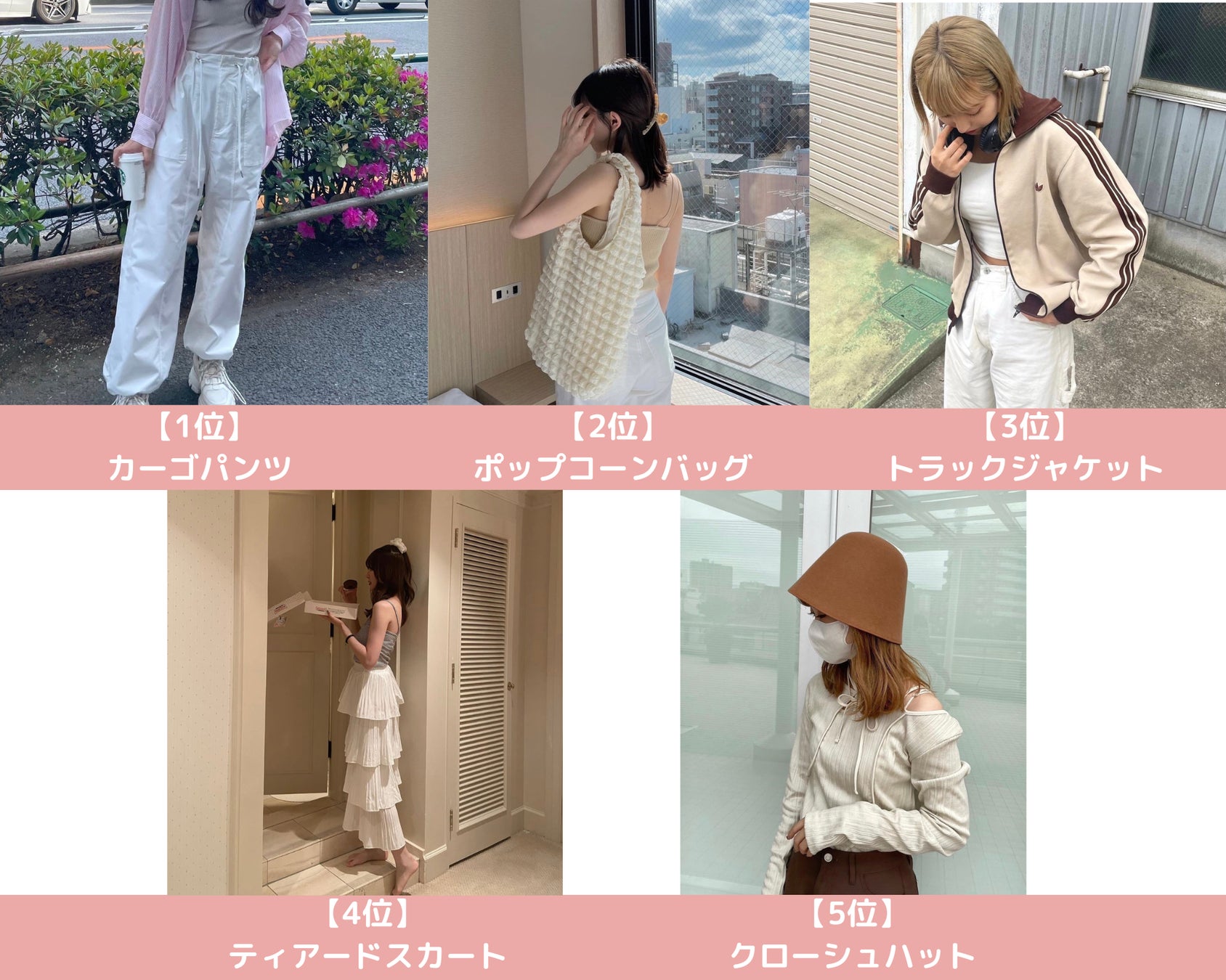 3位は「トラックジャケット」がランクイン。スポーツ選手が着用しているトレーニング用のジャケットが、パンツコーデだけでなくスカートにも合わせられるおしゃれアイテムとしてZ世代の間で大流行しました。Instagramでは、「#トラックジャケット」をつけた投稿が8万件を超え、TikTokでも、「#トラックジャケット」とつけた投稿の視聴回数が7,000万回を超えています(2023/5/31時点)。