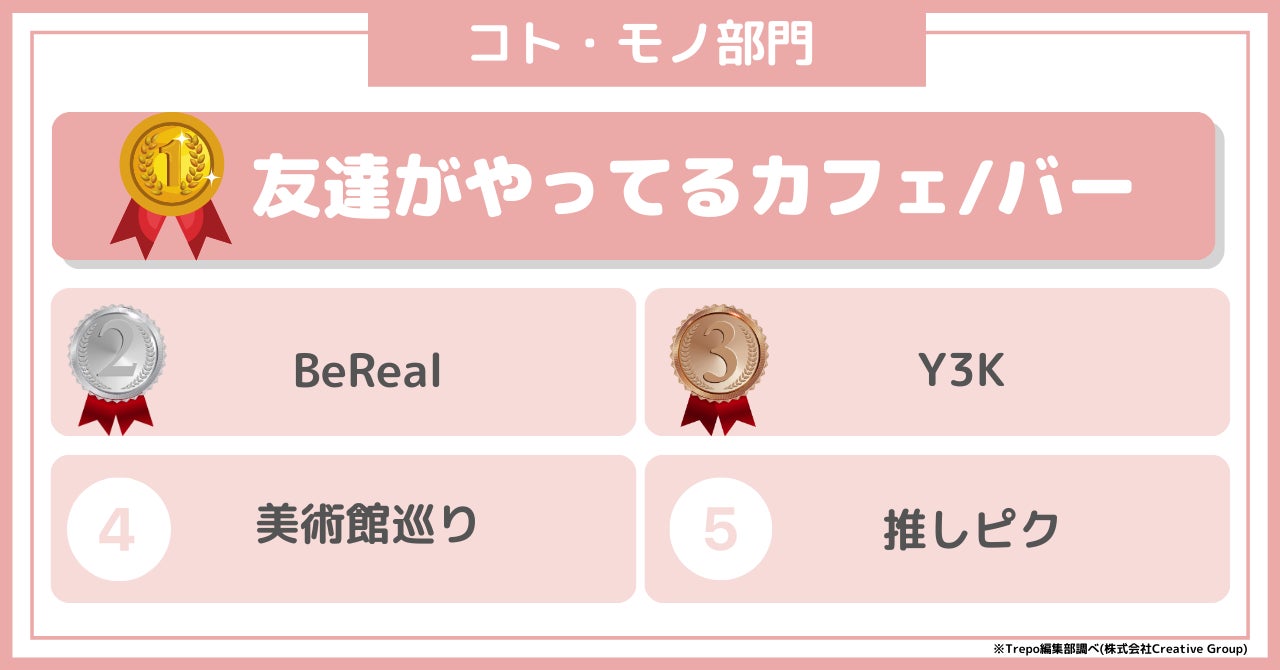 今回は、10代~20代の女性(Trepo girls)(※1)を対象に「コト・モノ」「プリクラポーズ」「ファッション」「グルメ・スイーツ」「流行語」の5部門に分け、2023年上半期のZ世代(※2)トレンドをランキング化しました。