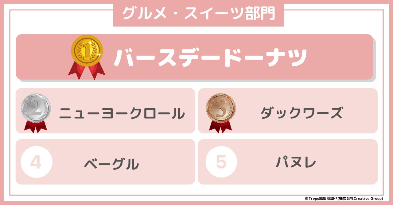 1位に選ばれたのは「バースデードーナツ」。バースデーケーキに代わり、文字やろうそくでデコレーションを施したドーナツを指します。簡易的でSNS映えすることから、2023年上半期、Z世代の「誕生日サプライズ」にかかせないスイーツに。また、神戸にあるカフェ「THE CITY DONUTS AND COFFEE(ザ シティドーナツアンドコーヒー)」では「HAPPY BDAY」のアルファベットの形をしたドーナツが販売され話題を呼びました。