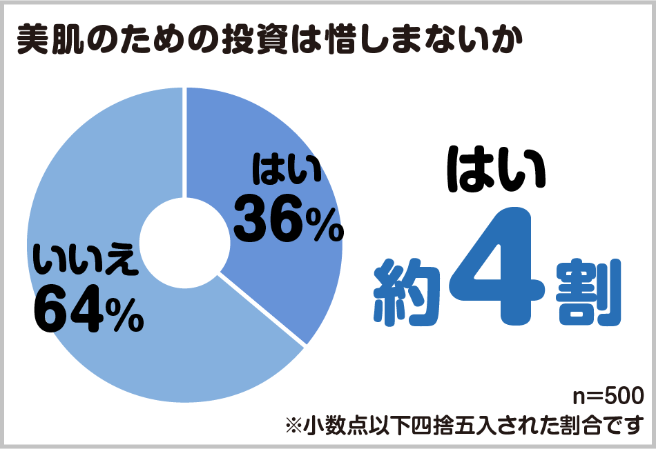 まず、「美肌のための投資を惜しみませんか?」という問いに対して、「はい」と答えたのはおよそ4割です。