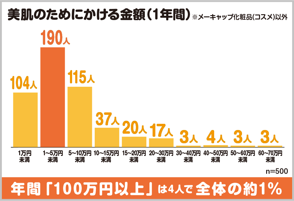 他の人が美容にいくらかけているのかも気になるところです。メイク以外の化粧品に年間いくら使っているか聞いてみました。