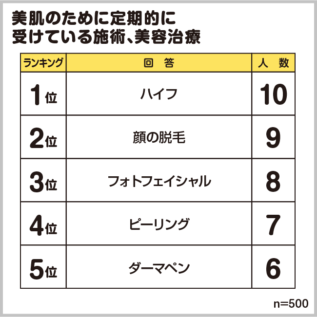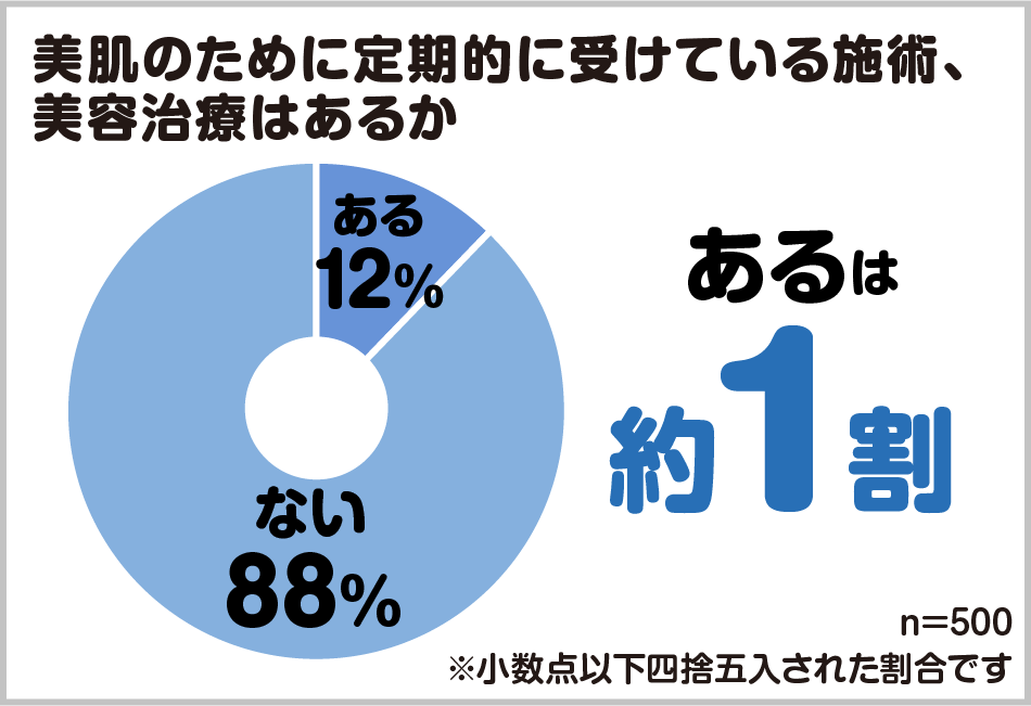 セルフケア以外にはエステに通ったり美容皮膚科に通ったりする方法がありますが、美容治療を受けている方は、全体の1割強と割合としてはそれほど多くはありませんでした。