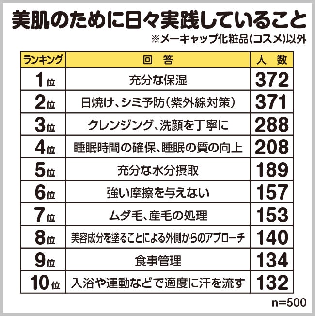 今回は、美肌女性500人に美肌のために実践されていることやどの方法が効果を実感できたかなど、「お肌に良いことアンケート」の結果をご紹介します。