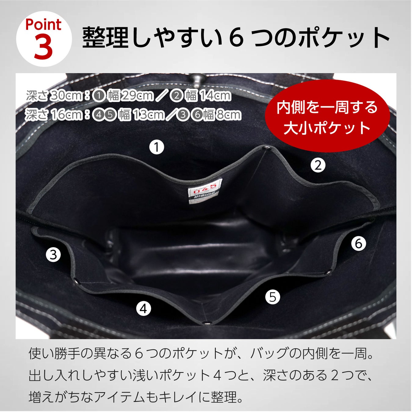 - バッグの内側を一周する大小6つのポケット。出し入れしやすい深さ16cmの浅めのポケット4つ(幅13cm×2、幅8cm×2)と、深さ30cmのポケット2つ(A4ファイルが入る幅29cm×1、ボトル収納に嬉しい幅14cm×1)。使い勝手の異なる内ポケットは、機能性バツグン。
