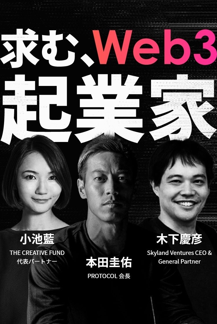 今回のANGELSは、本田圭佑、木下慶彦(Skyland Ventures CEO & General Partner)、小池藍(THE CREATIVE FUND 代表パートナー)ら、Web3の可能性を信じる一流投資家を審査員に迎え、「Web3特別版」として開催いたします。Web3の領域で起業されている方、起業を準備されている方のご応募をお待ちしております。