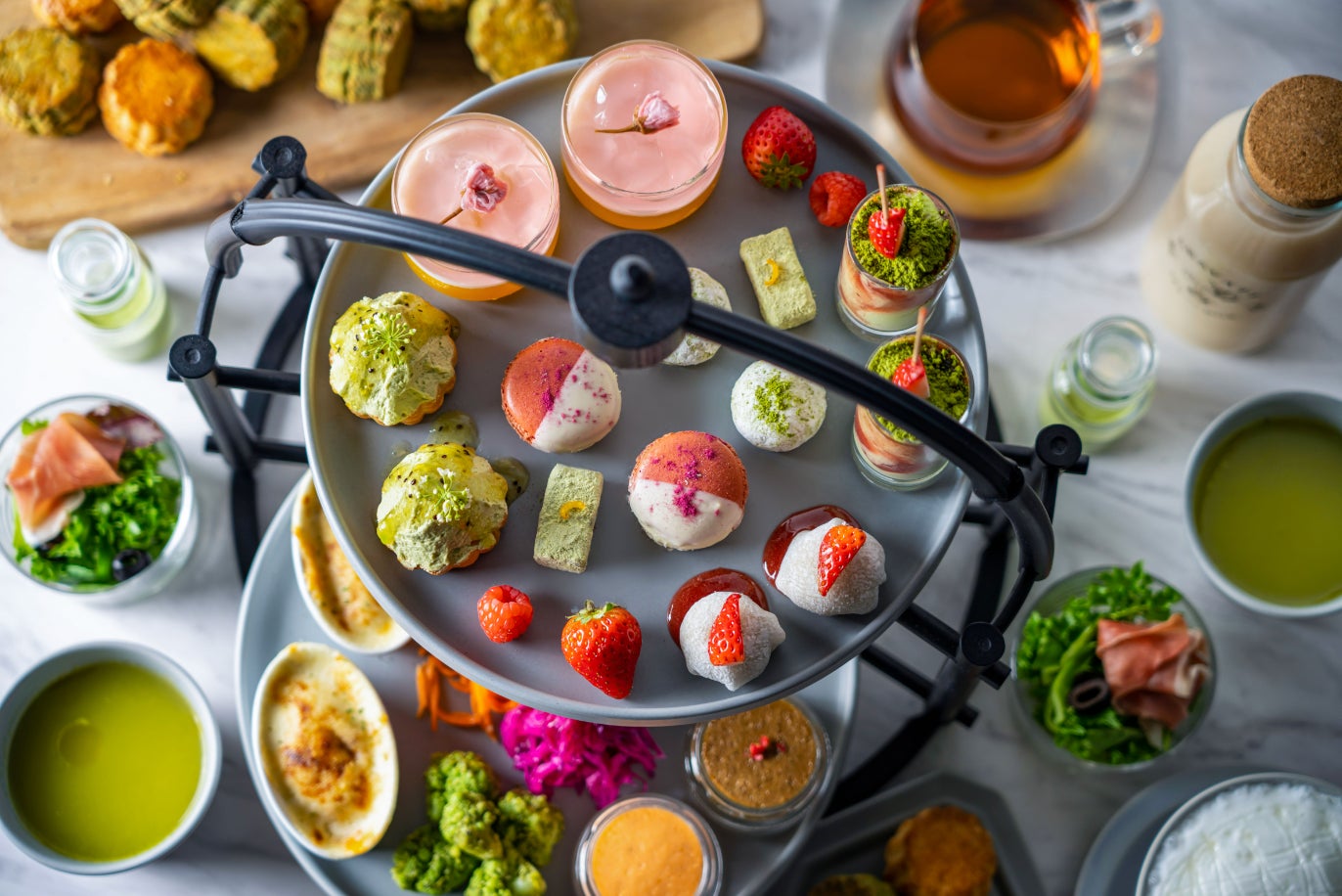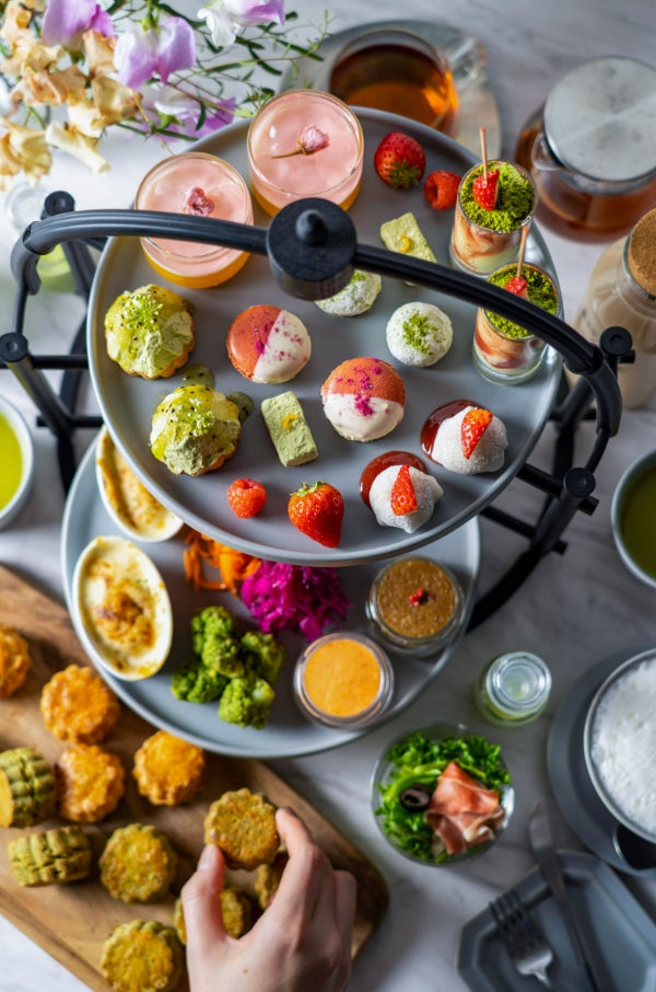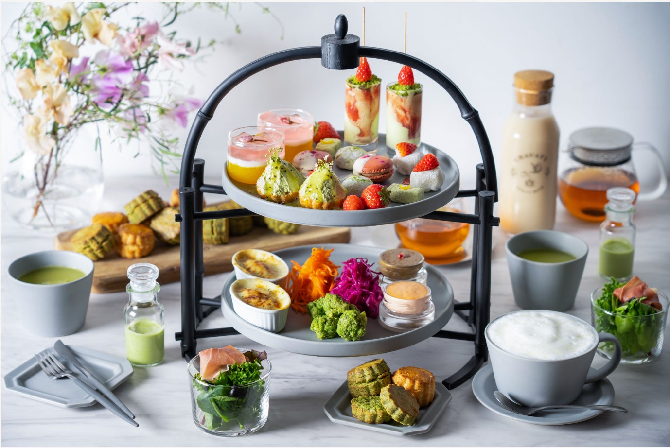 スイーツはライムチョコクリームと爽やかなキウイソースのせたスコーンタルトをはじめ、炭火ほうじ茶のテリーヌショコラなど。セイボリーは、宇治抹茶ドレッシングのグリーンハーブサラダやアスパラガスのポタージュなどをご用意しております。
