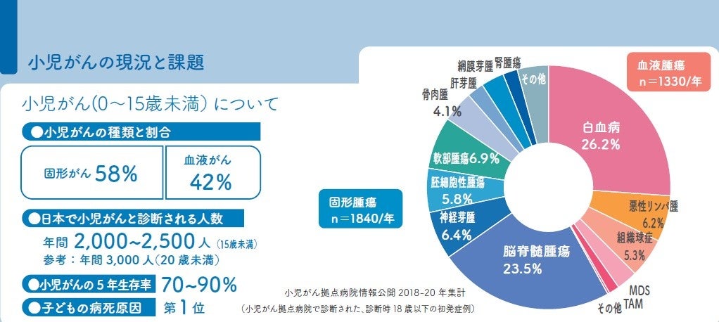 一般的に15歳未満の子どもに起こるがん(悪性腫瘍)で、毎年新たに診断されるのは2,000~2,500人と大人のがんに比べると少なく、また5年生存率は70~90%ですが子どもの病死原因の第一位であり続けています。