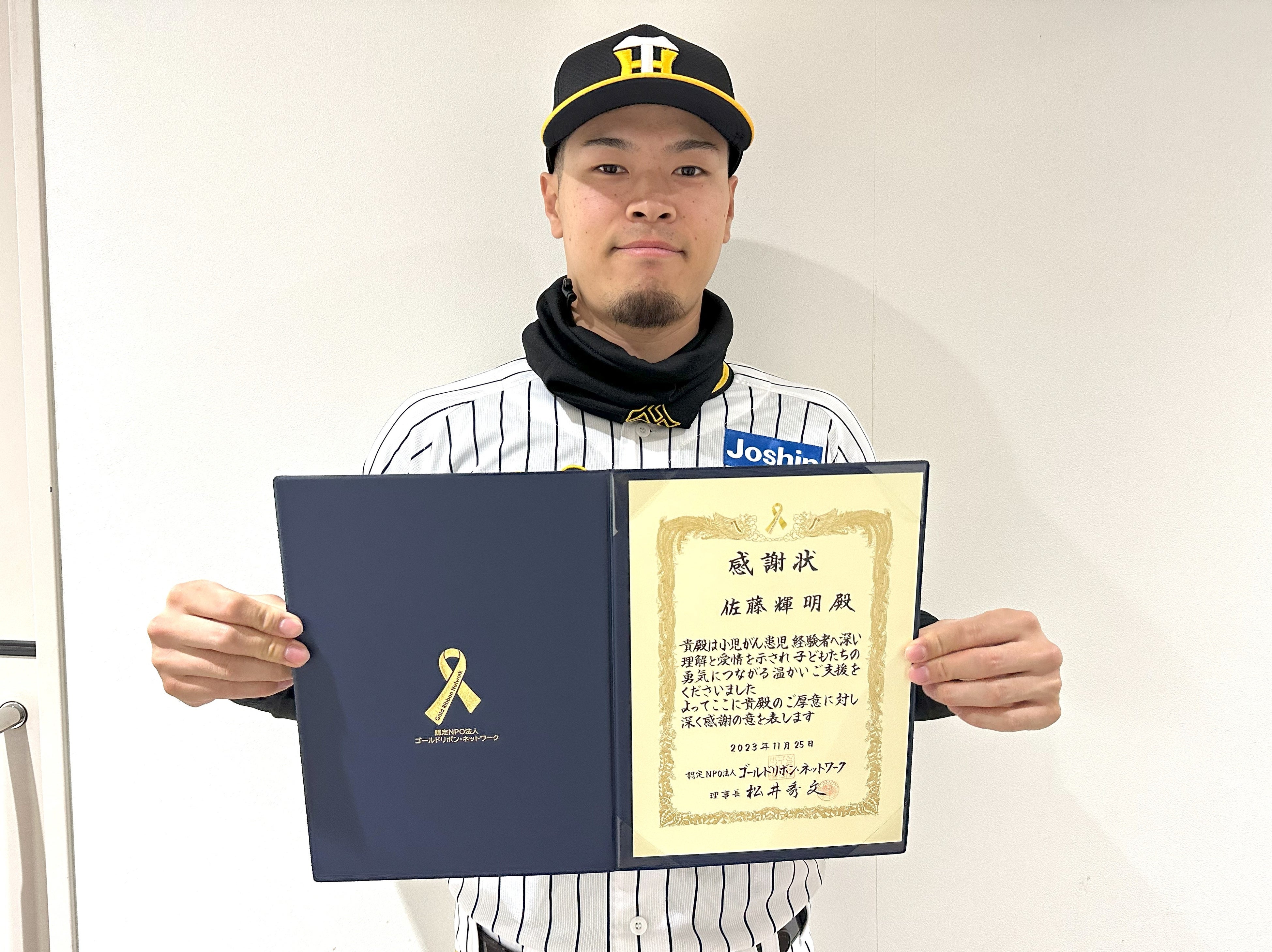 プロ野球で今年日本一に輝いた阪神タイガースの内野手主軸として活躍され、野球日本代表にも選抜されている佐藤輝明選手。このたび、小児がんとたたかう子どもたちを応援したいと当法人へ2023年の本塁打数にちなんだご寄付をくださいました。