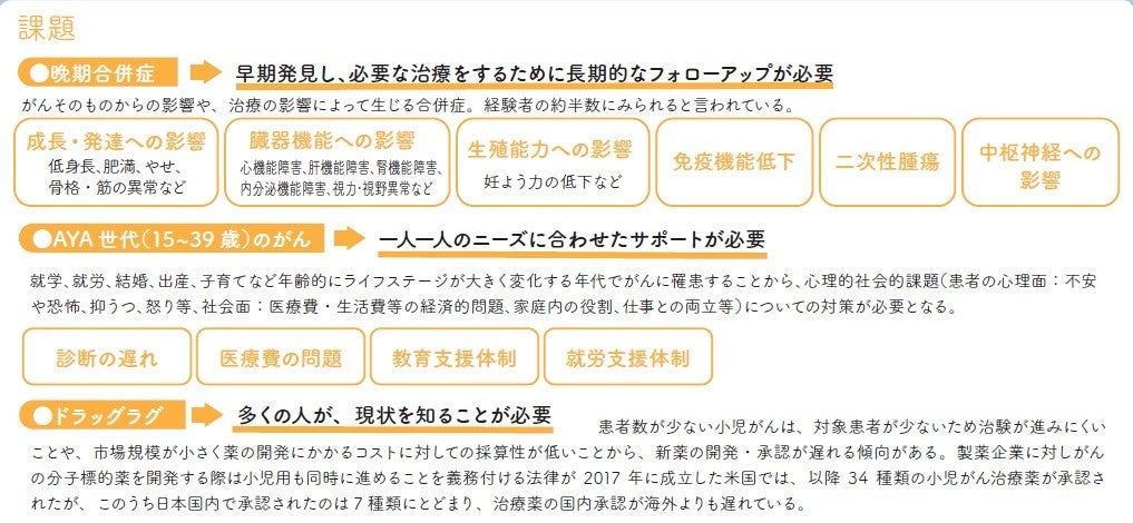 希少ながんでありながら種類が多くそれぞれの症例が少ないために、情報収集が困難だったり、自宅近くに適切な治療を行う病院がなく家族から遠く離れた病院に移動して長期間入院をしている患者も多く存在します。また、治療が終わっても、小児がん経験者の約半数ががんそのものや治療の影響による「晩期合併症」(後遺症)を抱えてその後の人生を生きる現状があります。しかしながら、それらの課題は大人のがんほど知られておらず、支援も不足しています。