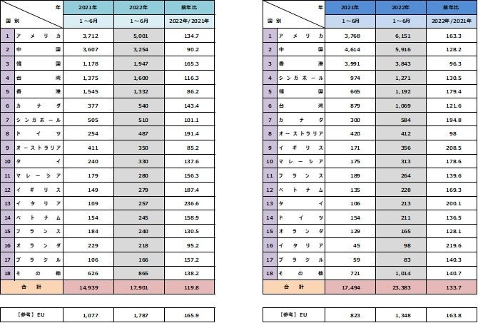●1~6月で過去最高の輸出金額を達成。総額約233億円(昨対比 133.7% )。2年前の2019年の通年輸出総額(234億円)とほぼ同等。
