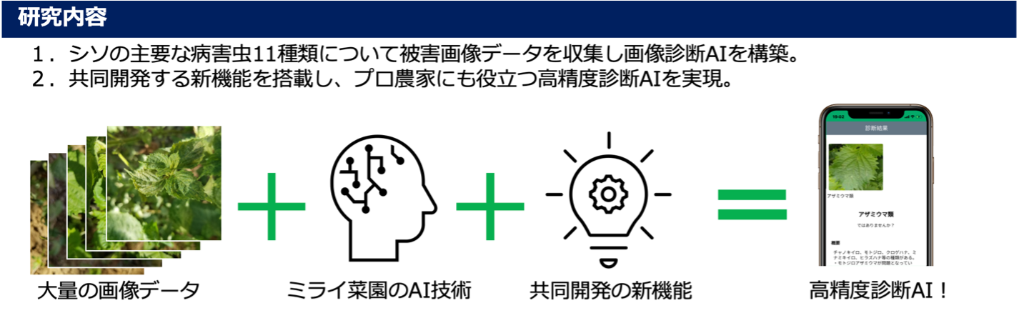 今後、シソ以外の主力野菜への応用も視野に入れ、さらなる研究開発を進めてまいります。また、ミライ菜園では、本技術を現在提供中の病害虫発生予測AIを搭載する防除支援アプリ「TENRYO(テンリョウ)」へ将来的に統合する計画です。