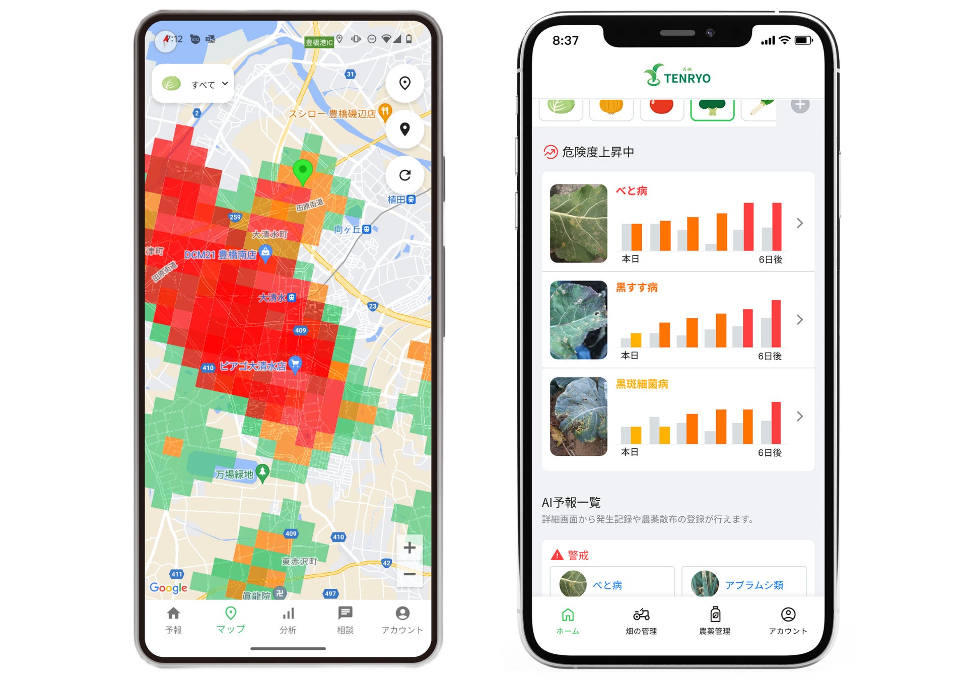 TENRYOは、AIが病害虫の発生を予測して適切な農薬散布タイミングを知らせたり、適切な農薬を推奨してくれる「AIドクターアプリ」です。キャベツ、ブロッコリー、といった愛知県で生産が盛んな野菜のほか、柑橘類など13種の農作物に対応しています。本技術の開発により、「予測」から「診断」、そして適切な「対処」までを一気通貫でサポートする、防除に特化したデジタルプラットフォームの構築を目指し、今後、シソ以外の主力野菜への応用も視野に入れ、さらなる研究開発を進めてまいります。
