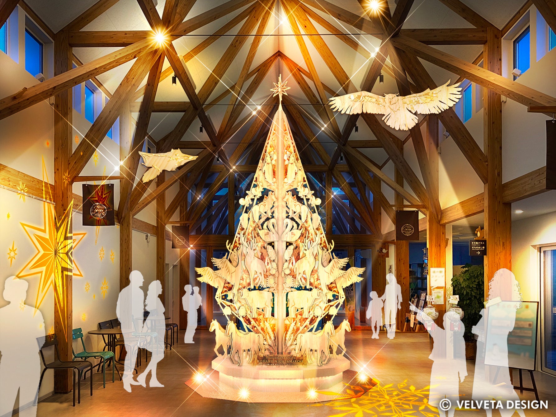 イベントを象徴するシンボルツリーが、道の駅ガーデンスパ十勝川温泉のからまつコリドーに登場します。ツリーは温かみのある「琥珀色」にきらめいて、訪れる人たちの心をホッとあたためます。このシンボルツリーは「育てるウッドオブジェ」として来年以降の再利用を前提に制作されており、アートとエコの共存を図ることを目指しています。