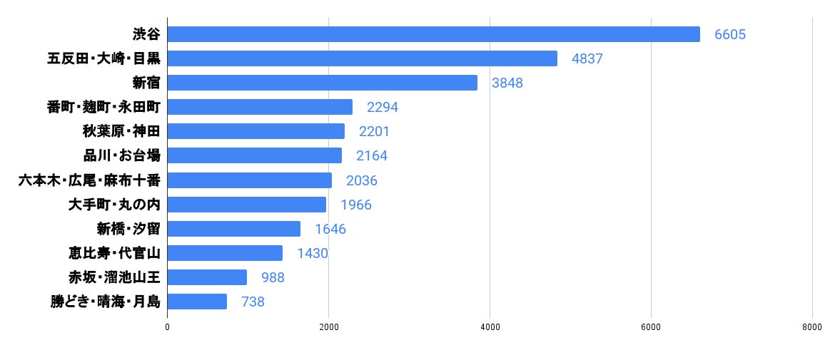 また、五反田・大崎・目黒エリアが渋谷エリアに次ぐ、開発案件数となりました。特に五反田駅周辺エリアは近年、「五反田バレー」とも呼ばれ、新たなITスタートアップの集積地になっています。特に、周辺に社員が住みやすいメリットや、渋谷エリアや六本木エリアに比べて賃料が安価などのメリットがあり、オフィスを構えるITベンチャーが多い傾向があるとも言われています。