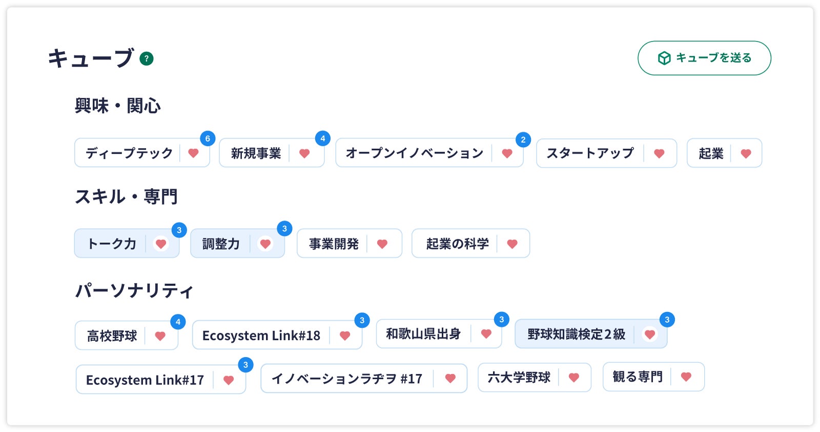 (白キューブ:自身で登録したキューブ青キューブ:他者が登録したキューブ右上の数字は各情報に対して称賛された回数)